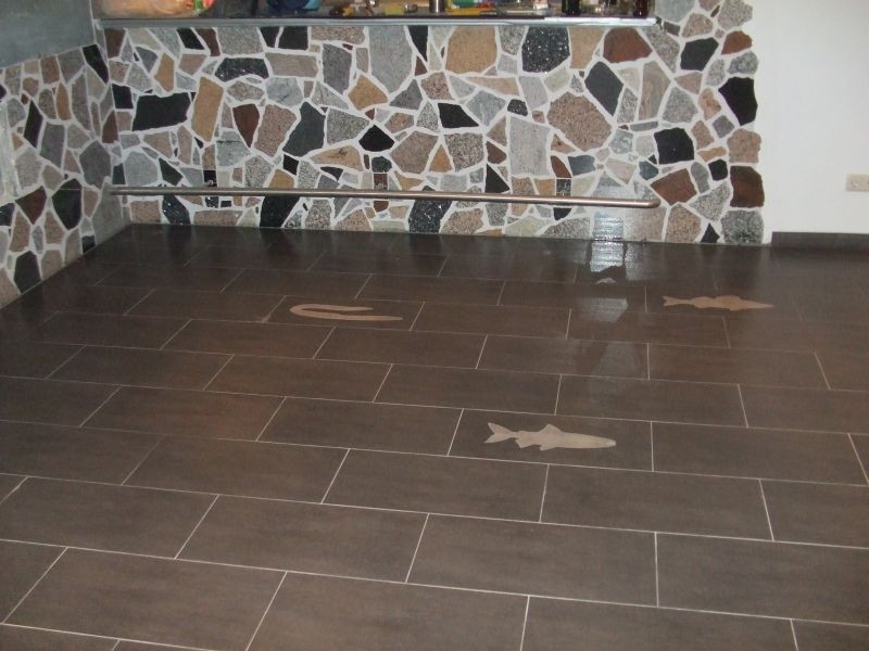 Das Fischmuster wurde aus einer Fliese herausgeschnitten, die Oberfläche der Fliese wurde abgestrahlt und danach wurde das Teilstück wieder in den Fliesenrahmen eingesetzt.